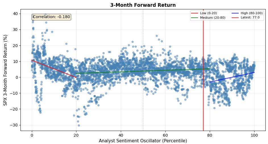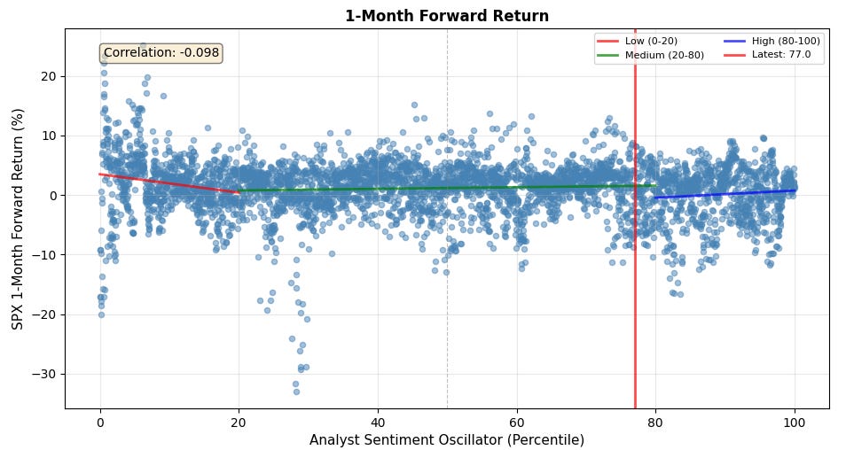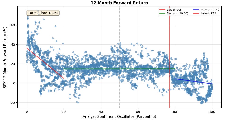 The 12-month forward is really interesting. It is telling you to fade the analyst sentiment oscillator on any low or high reading. Buy when they are pessimistic, sell when they are overly optimistic.
