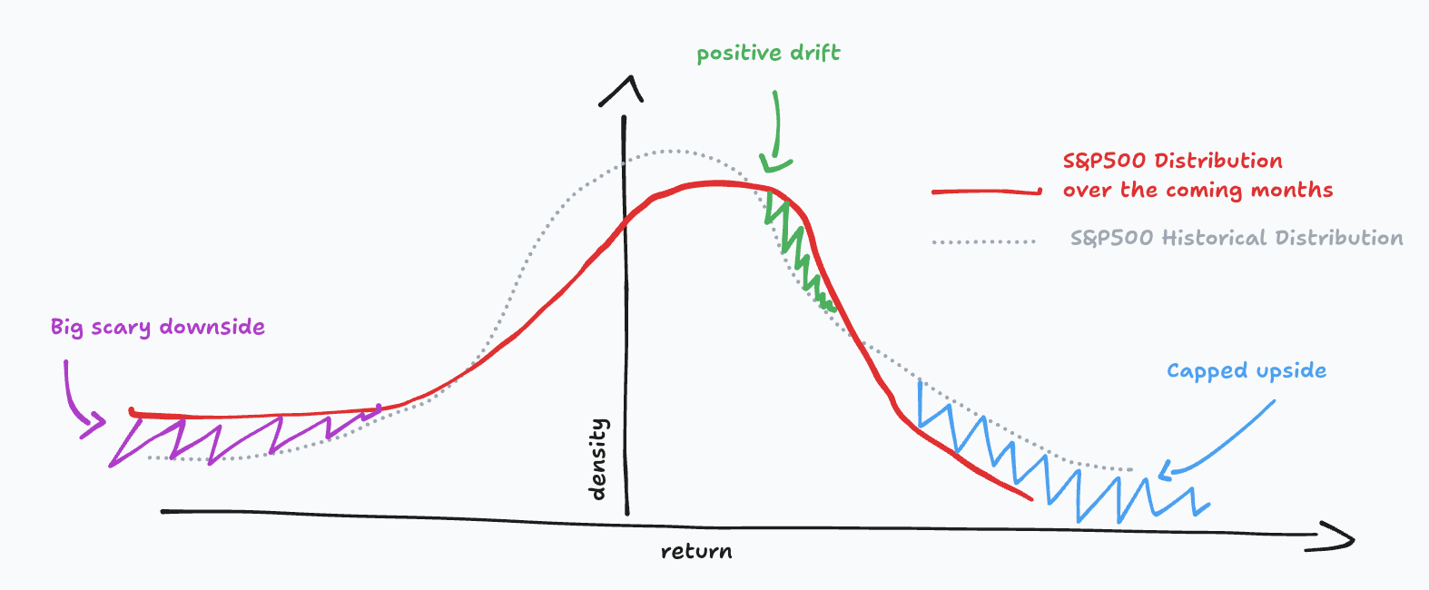 If there is one thing you should remember for this week, it is this: the market is priced for perfection. The expected distribution for the S&P500 returns is one with deeply negative skew but a positive median return, and capped upside.