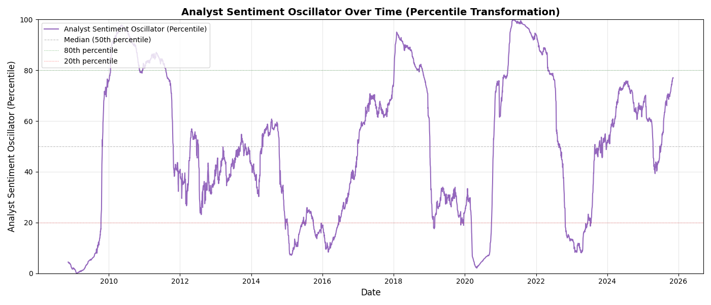 To confirm my intuition, I built the Analyst Sentiment Oscillator below. It is built from the rolling rate of change of the EPS NTM over different windows. It gives a good insight into how optimistic or pessimistic analysts are. This is not a perfect measure by any means, but it does the job: telling us when all the analysts are on the same side of the boat.
