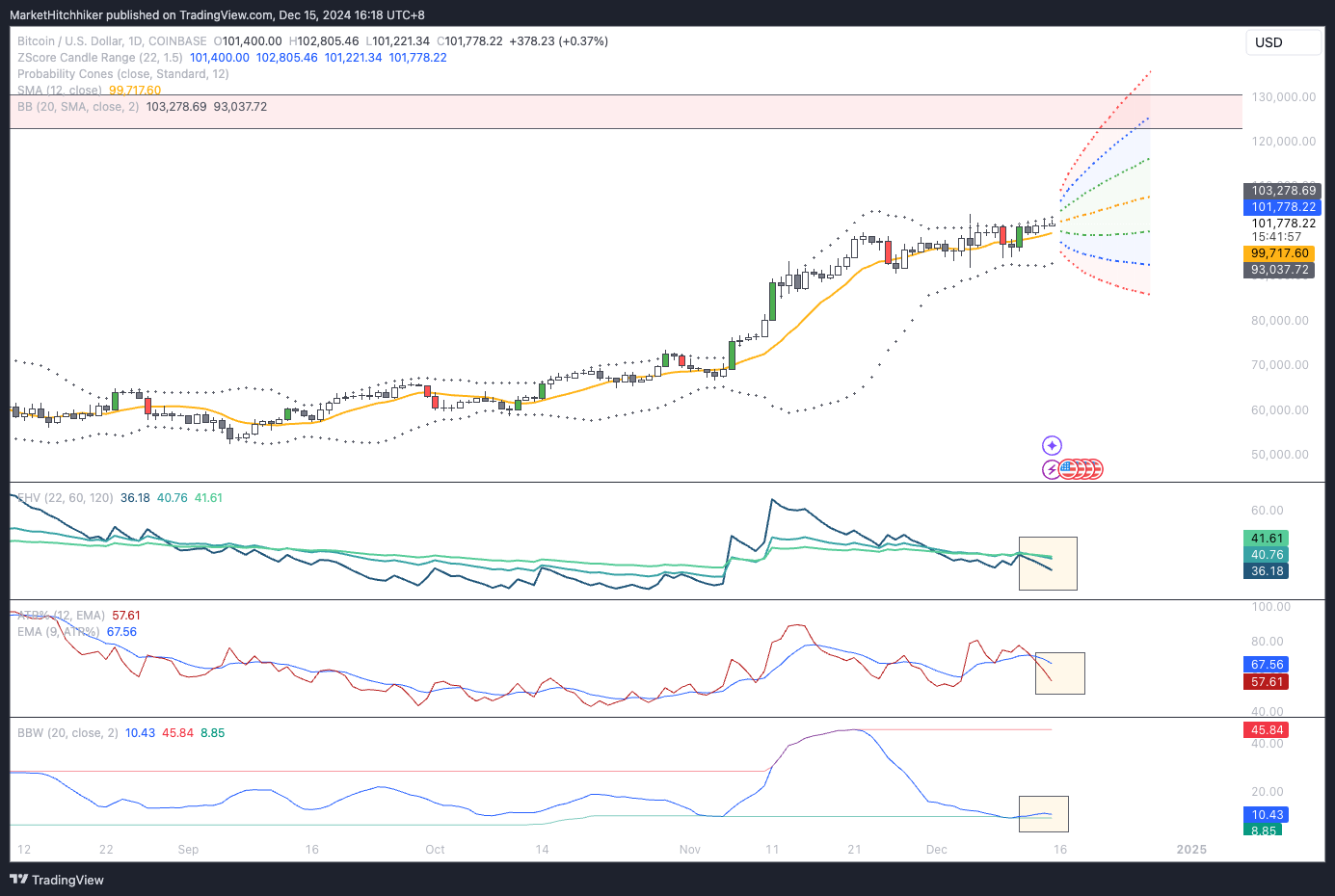 The price action is constructive because we have a positive drift since 10th of December. Moving average 12 days is still rising nicely, and we are seeing higher lows on each individual daily candle. Finally we have realized volatility compressing significantly, the daily range is very tight: