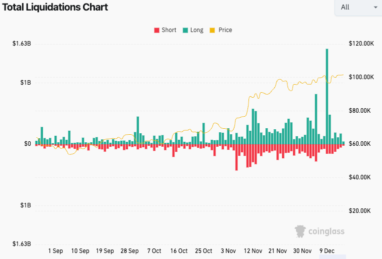 Like clock work, prices got violently rejected from the 100k level and nuked to 92k. Massive liquidation event — approximately $1.1 billion got liquidated. The largest liquidation event I can remember.