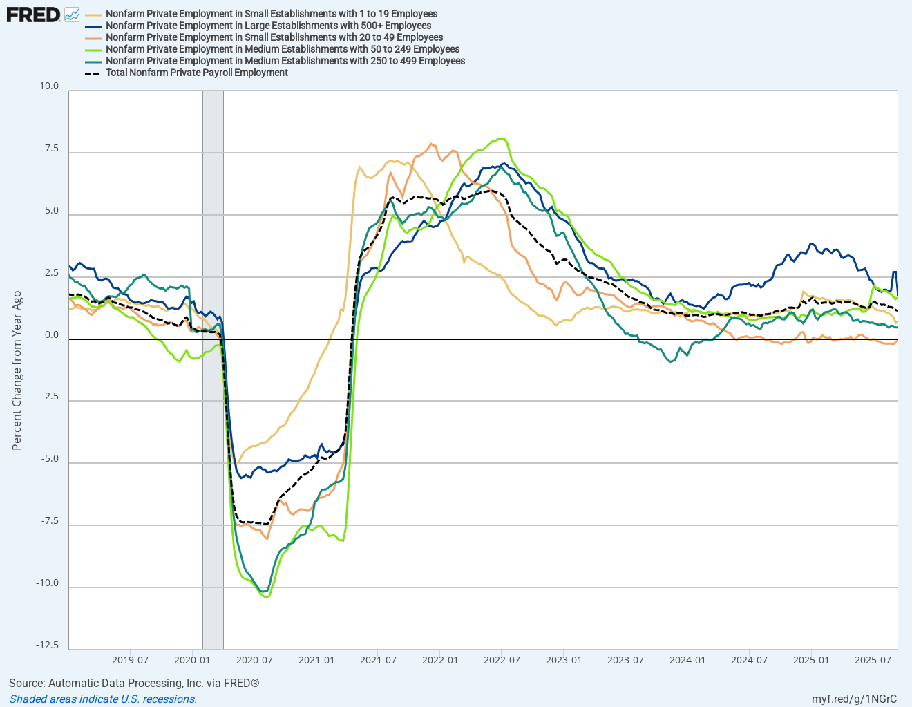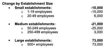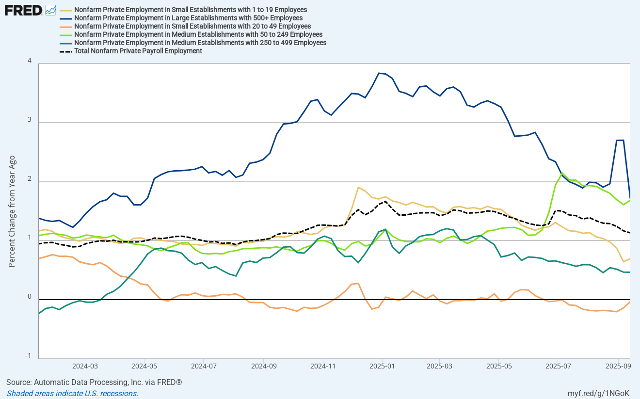 A K-shaped economy also means a K-shaped job market. The bulk of the growth has been coming from the large companies; this has been true for this September report as well: