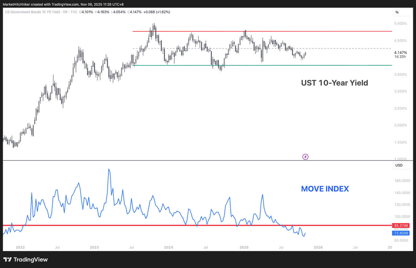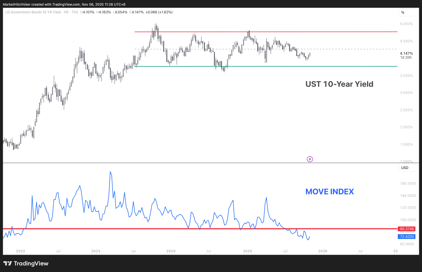 The UST 10-Year Yield has been trading for the past two years in a range of [3.75% ; 4.75%]. We are currently trading slightly below the middle of that range. From a pure technical perspective, the yield is stuck in a mean reversion process and it could go either way. What I find more interesting is the MOVE Index breaking lower; it has finally exited the range above 85% which has been the lower bound established after the great bond bear market started after Covid. It confirms my intuition that the inflationary tail risk has disappeared. This could come as a shocker for a few of you; one of the popular opinions is that the only thing that could derail this stock market is a burst in inflation. After all, every stock market bubble got popped either by an inflationary boom or bust. And given the current state of affairs (fiscal dominance), the natural way for this market to evolve would be for energy prices to rise and for inflation to follow. Well, as long as the MOVE Index is trading in a downtrend, I will push back against this view.