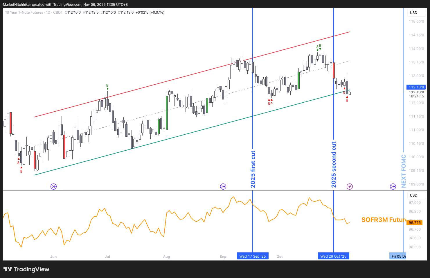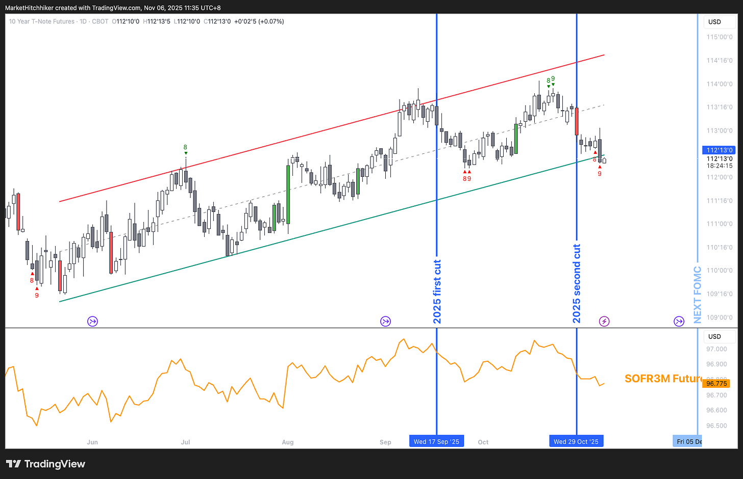 Over the last year, the ZN has been in a clear uptrend. The last price is now sitting at the bottom of the regression channel. That line is obviously made up, but a regression channel is a lesser evil than an arbitrary trend line drawn by yours truly. At least there is some sort of statistical truth in that channel: the trend is up and now the price is sitting at 2 standard deviations lower. It is time to decide your side: are you still a bull, or is it time to fold? The lower panel is the SOFR 3Months future expiry September 2026. I chose this expiry because it captures the bulk of the coming rate cuts