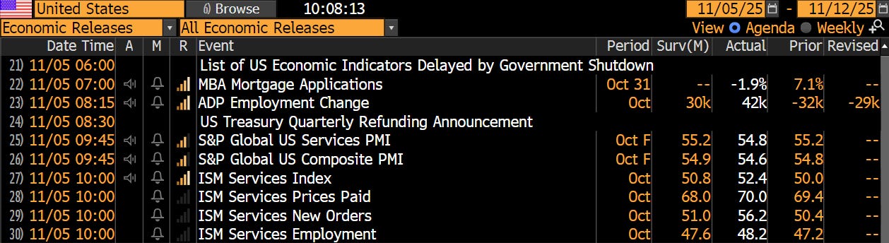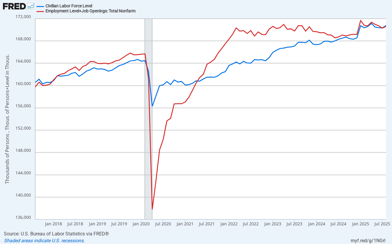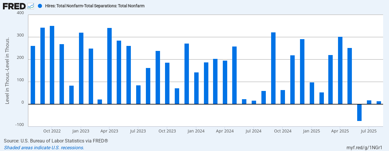 Again, this data is from August and we are still flying blind during this government shutdown. However, the trend has been clear: we went from a tight job market to a loose one, and I am not expecting this trend to have changed since August. Despite the expectation beat in ADP employment change, and the uptick from August, the trend is still lower.
