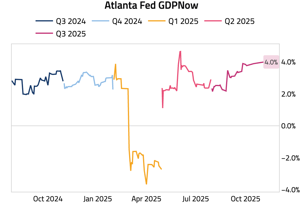The US Government shutdown has not been helping either; we have no data and the widely used Atlanta Fed GDPNow is now clocking at +4.0%, this looks extremely optimistic to me. There is a high chance this variable renormalizes a bit before the end of the year; that should mechanically reprice the yields lower.