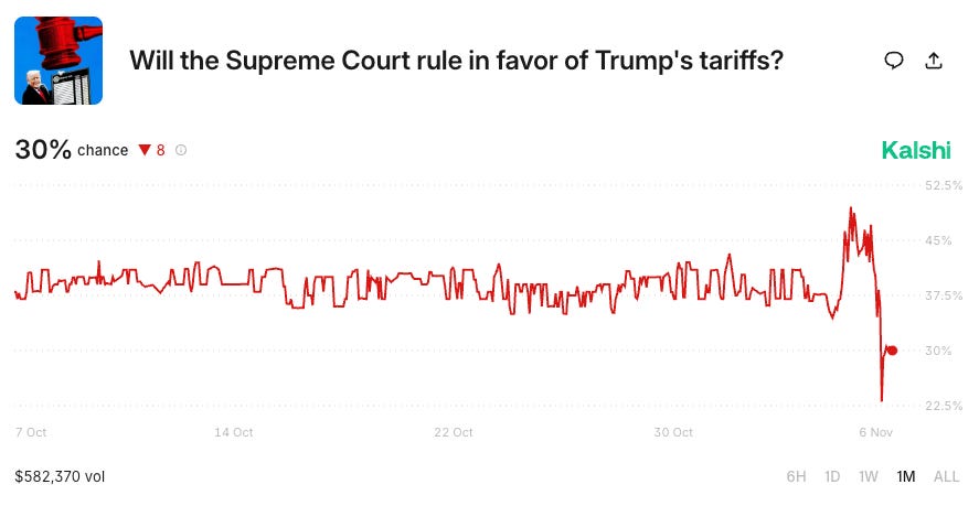 The market is repricing lower the probability of SCOTUS ruling in favor of Trump’s tariffs. A large refund of tariffs would be a hit to the US debt-to-GDP, adding more pressure to yields. This is a big deal; refunding the tariffs is one thing that the market can absorb easily, but the lack of tariff revenues over the next few years will mean the fiscal impulse will switch from negative to positive.