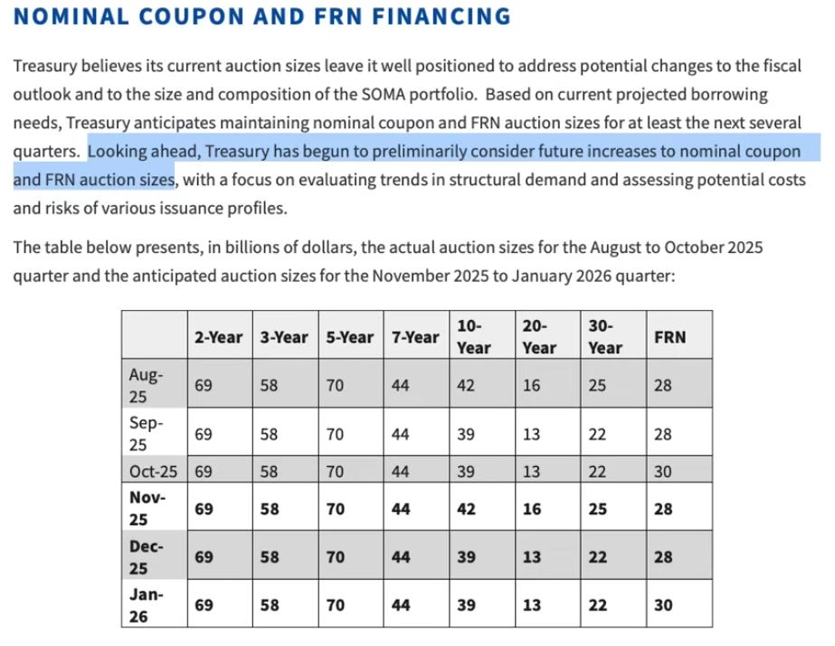 The Treasury QRA met expectations, however, the guidance was toward more issuance of long-term debt: “Looking ahead, Treasury has begun to preliminarily consider future increases to nominal coupon and FRN auction sizes”