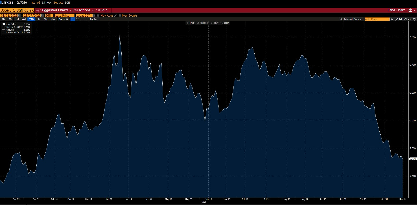 Inflation Swaps: 2-year inflation swaps are comfortably sitting at 2.70%. No reflation fears here.