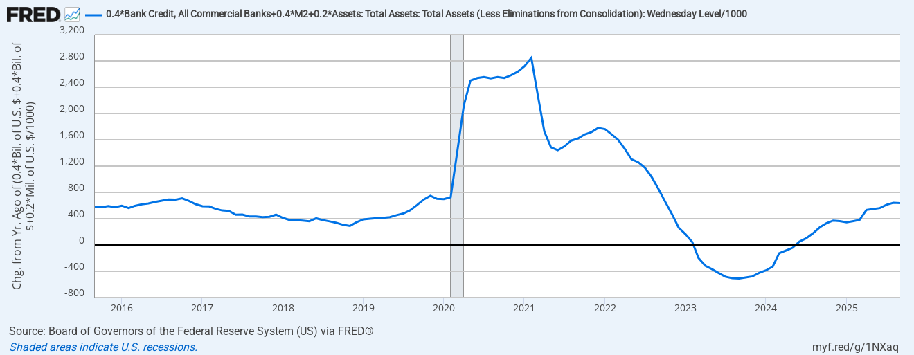 Monetary Impulse: The blended measure of yearly change in banks’ credit, M2, and Fed balance sheet indicates a neutral impulse from monetary policy. The Fed is neither restrictive nor loose.