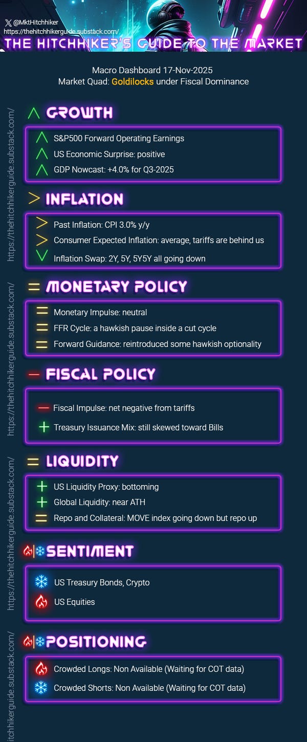 After two months of government shutdown and a lack of hard data to guide them, macro analysts are all over the place. And in case of doubt, what’s better than diving headfirst into simplistic narratives that fit your priors? A quick glance at my X feed reveals all kinds of conflicting macro views battling for attention. The reflationistas are eyeing the energy sector like it’s about to break out the way miners did. The stagflationary pundits are busy shorting SOFR futures after Powell’s hawkish reversal. Growth Tech bros are watching their AI darlings hold on for dear life. And finally, the modern Cassandras are shorting the stock market in anticipation of a deflationary bust.