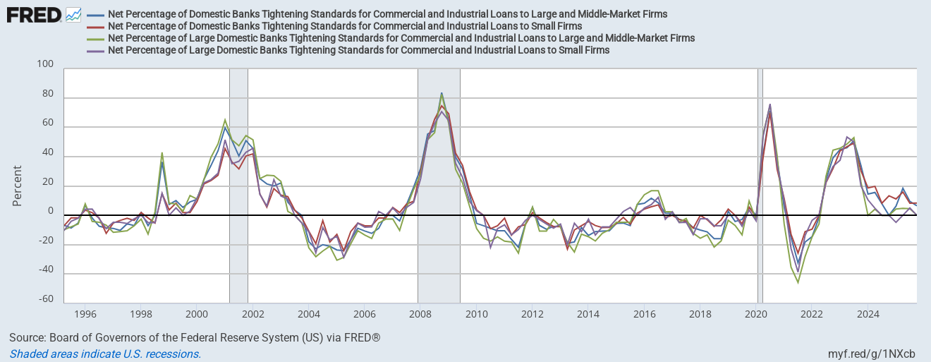 This neutral monetary impulse trickles through the tightening standards of the banks. After completing a tightening cycle in 2023, banks are still somewhat tight. The SLOOS data (chart below) indicates increasing tightening standards. We are not in an easy credit environment despite record-narrow spreads in the high-yield space. Financing has simply been pushed toward private markets.