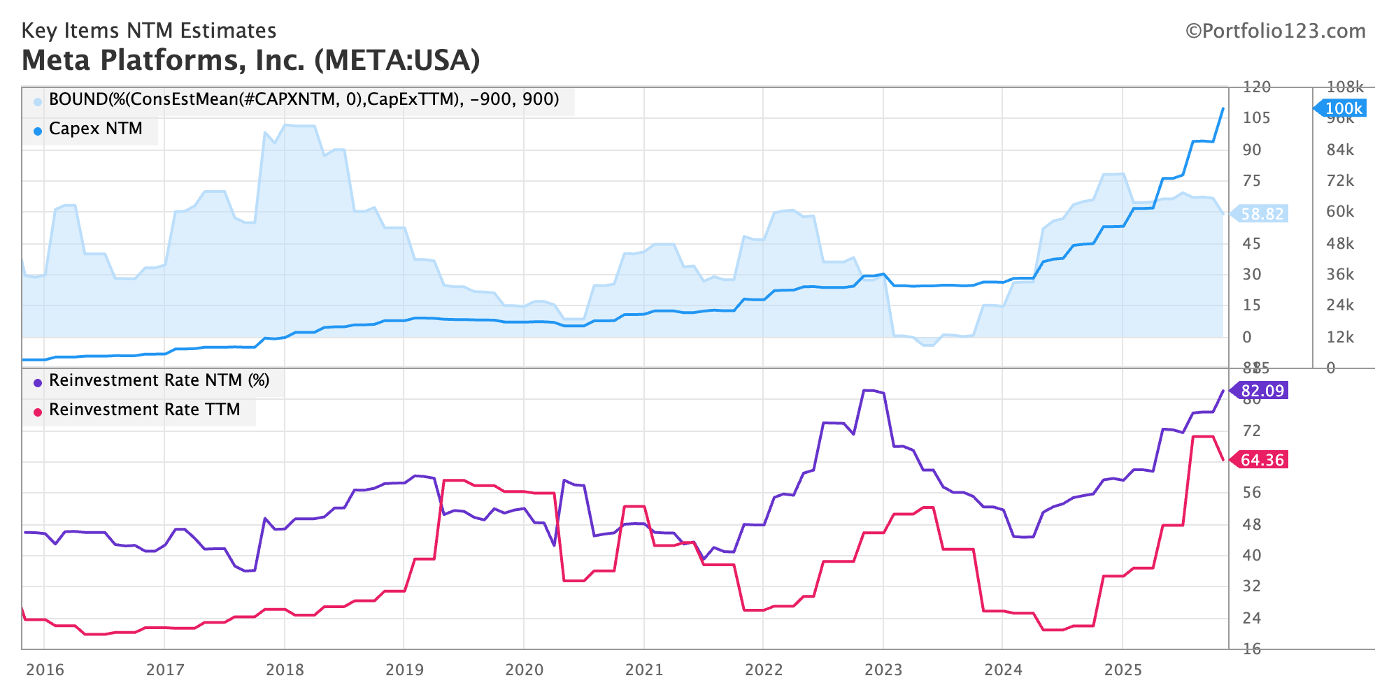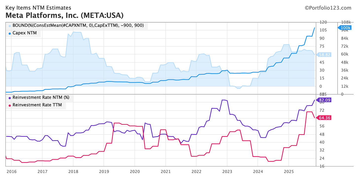 Capex is ballooning; the next-twelve-month capex is forecasted to reach $100 billion. This is the entirety of their free cash flow, and more. The next-twelve-month reinvestment rate (measured as 1 - FCF / EBITDA) is sitting at 82%; this is as high as during the metaverse episode.