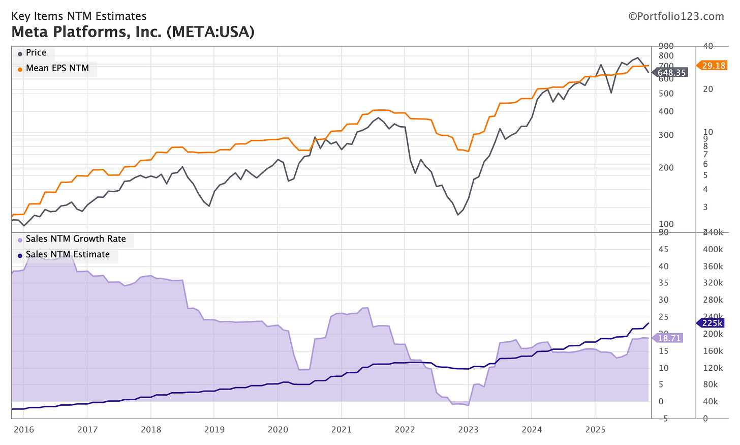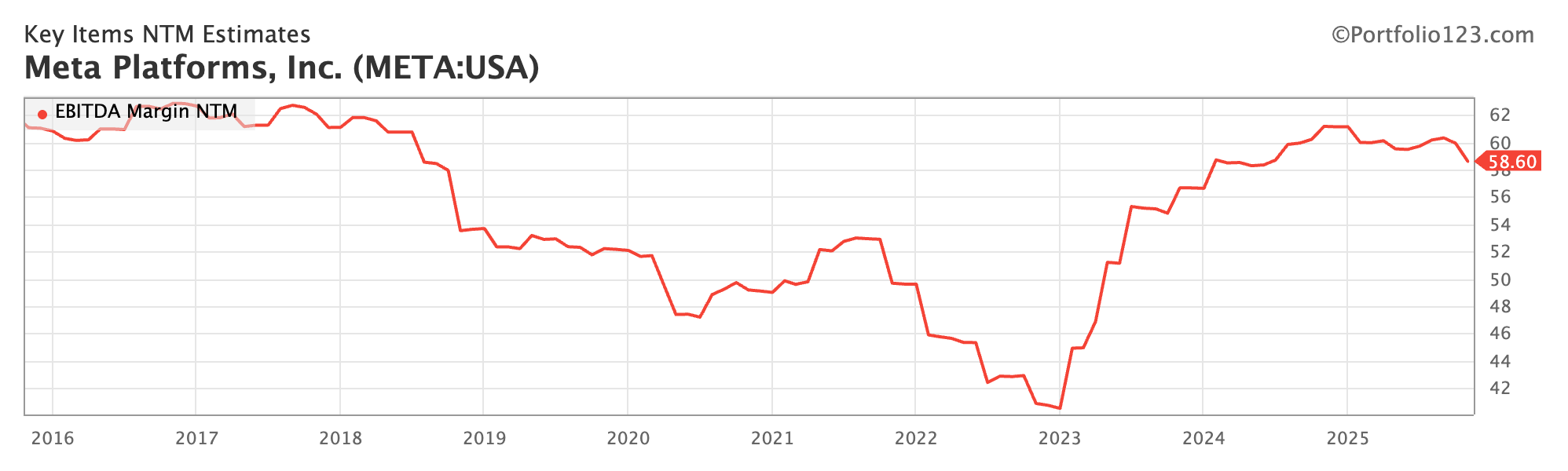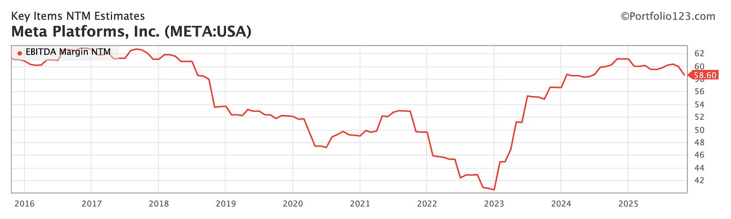 EBITDA margin is incredibly high; the forecasted next-twelve-month margin is 58.60%. Can it go higher? The path of least resistance looks to be lower. There is a lot of cyclicality in this EBITDA margin NTM chart; it tells me we might have peaked here. Again, Zuckerberg needs AI to keep the margin this high