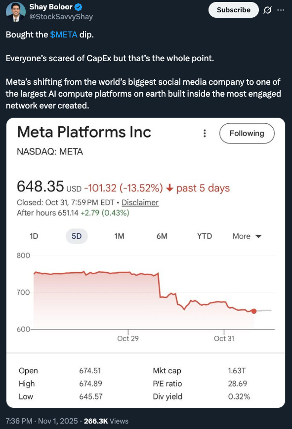 Meta stock has been trading significantly lower following a gap down post-earnings. This is 100% idiosyncratic risk, as the market is re-rating the stock lower for fundamental reasons: the bet on AI expressed through large capex is risky. A riskier business model will introduce more volatility in the earnings. While the top-line growth is still rosy for Meta, the bottom-line growth is taking a hit. Fundamental investors are questioning the ROIC of all this capex. This is a significant shift in the market mood; so far, all companies increasing their AI capex have been rewarded, until META earnings this week.