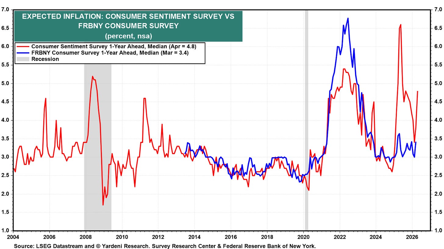 Expectations might start to be unanchored over a one-year-ahead basis. The FRBNY survey is still showing a tame outlook, but the Consumer Sentiment Survey is spiking once again.