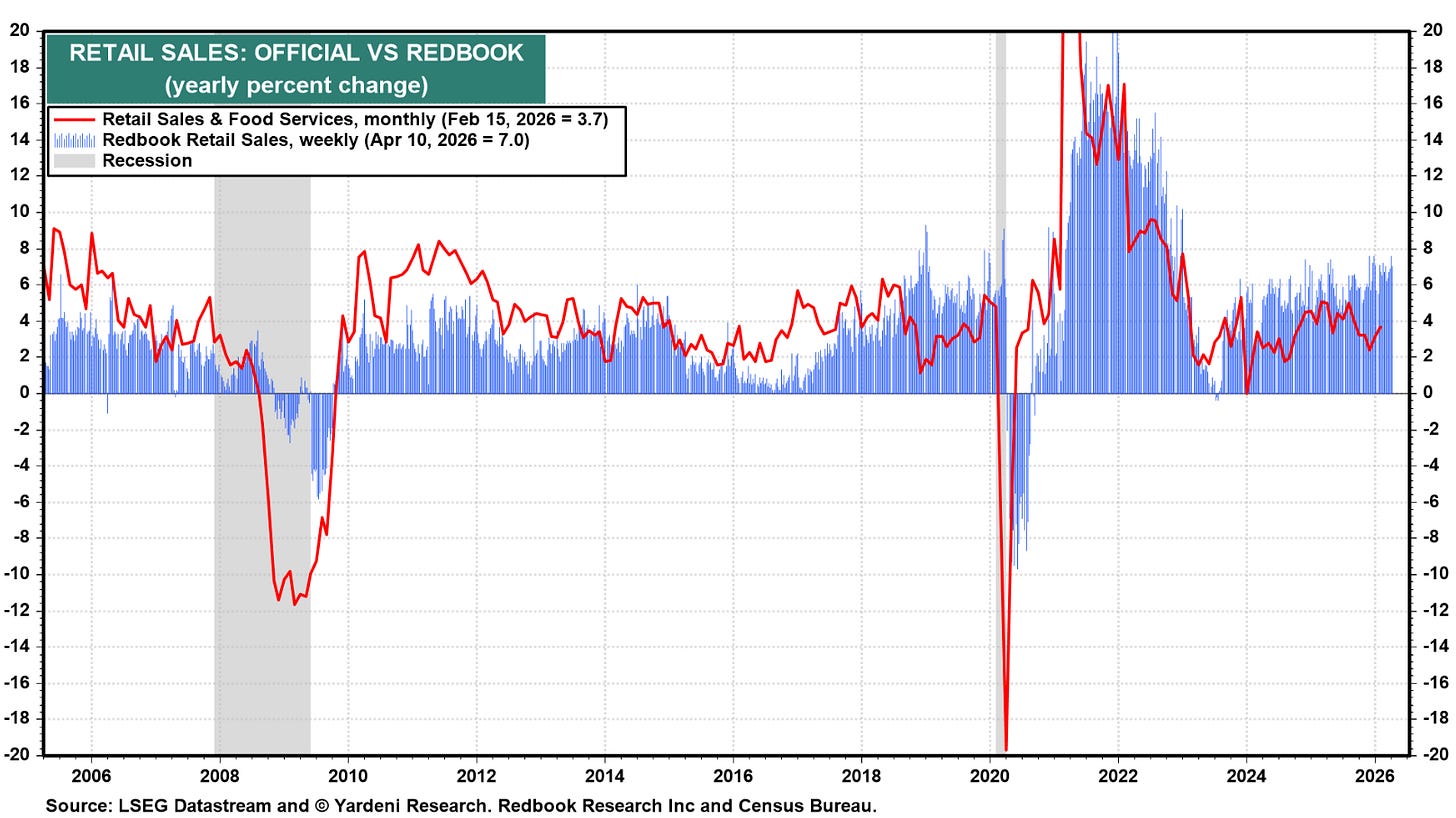 Redbook retail sales doesn’t put as much weight on leisure and other weather-dependent activities, and it is pointing toward a strong consumer.