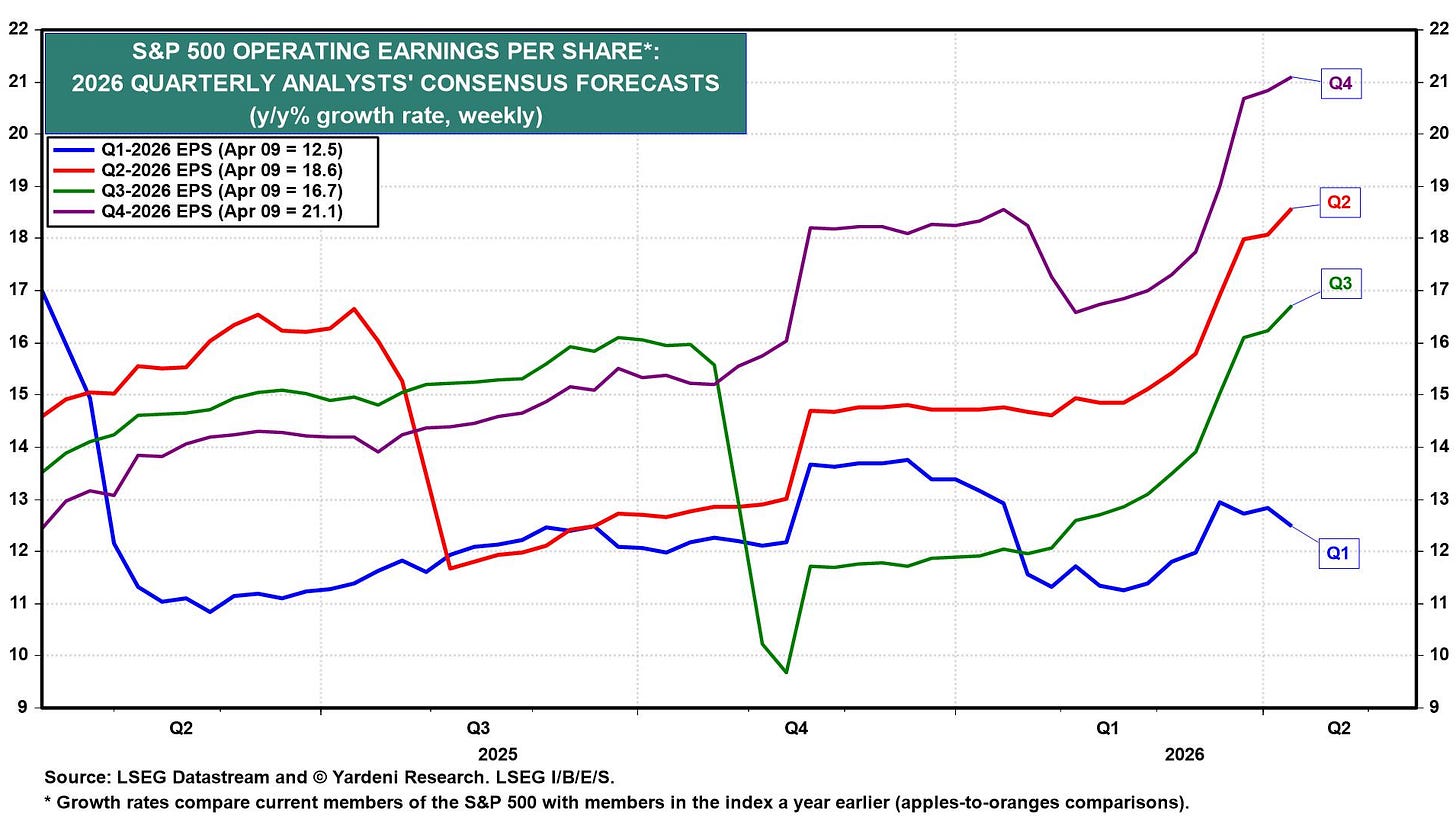 Forward EPS for the S&P 500 did not flinch at all during the conflict. On the contrary, they are still ripping. Every single quarter of 2026 is expected to grow at double digits.