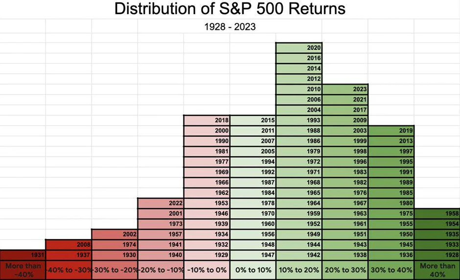 J.P. Morgan allegedly said “Funny thing about these skyscrapers—not a single one was built by a bear!”. And he was quite right! Ever since he died in 1913, the S&P 500 has returned approximately a whopping 35,500%. Good luck being a bear! Over the past 30 years, the US stock market has only recorded 11 down years:
