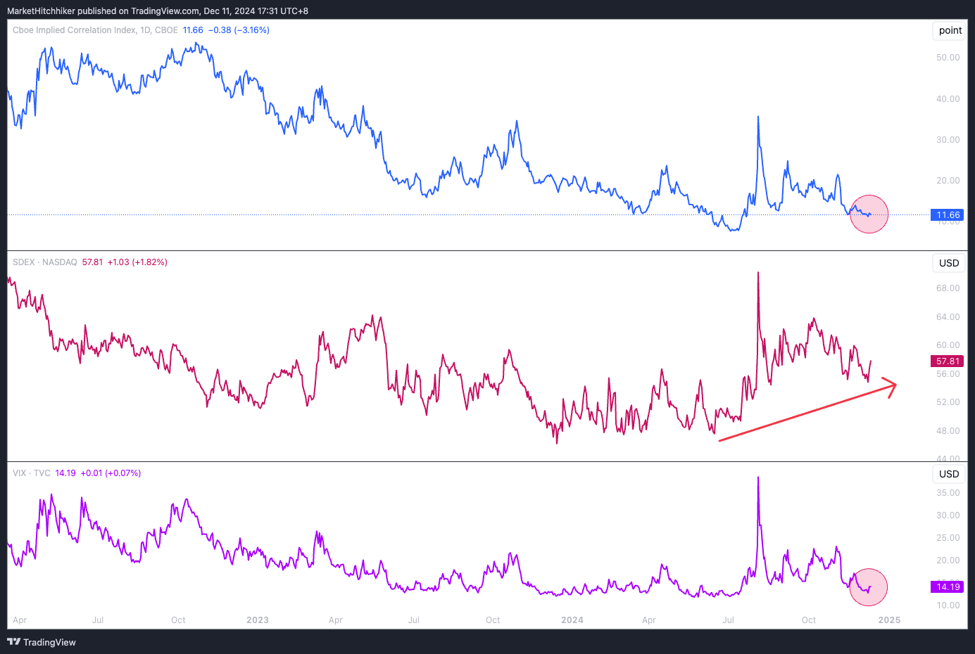 Implied correl 3m in the lows, skew is basing higher, vix in the lows.