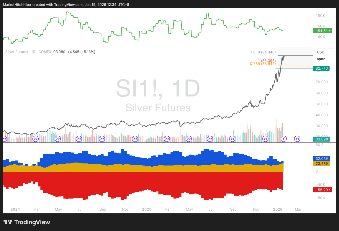 Silver: The same goes for silver, with small speculators now over their skis. Large specs still have a lot of buying to do before the COT data becomes crowded long.