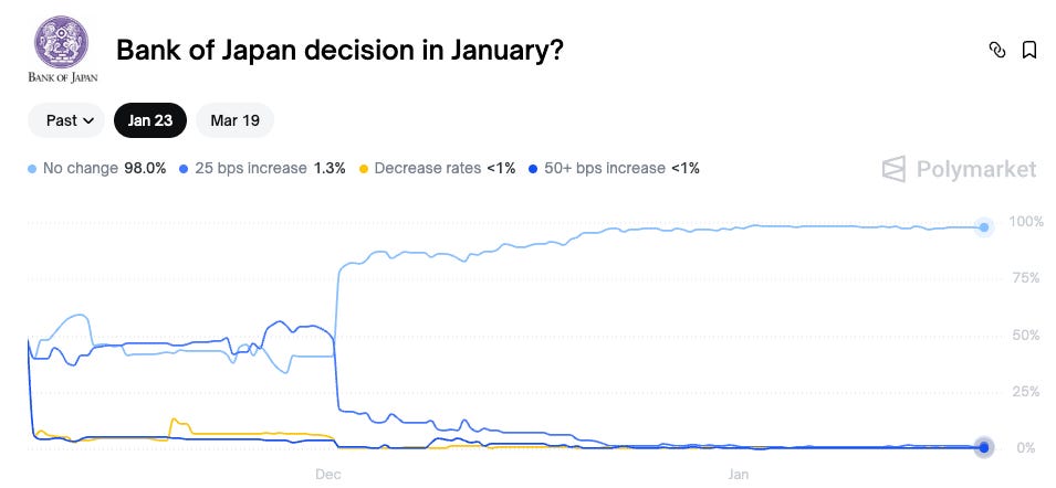 This narrative pushed the yen back to 159 against the USD. The market is sending a signal to the BOJ that rates are still too low and that they are falling behind. They can either intervene directly in the FX market or simply do their job and… hike. But the market is pricing a 0% chance of a hike in January and only a 25% chance in March.