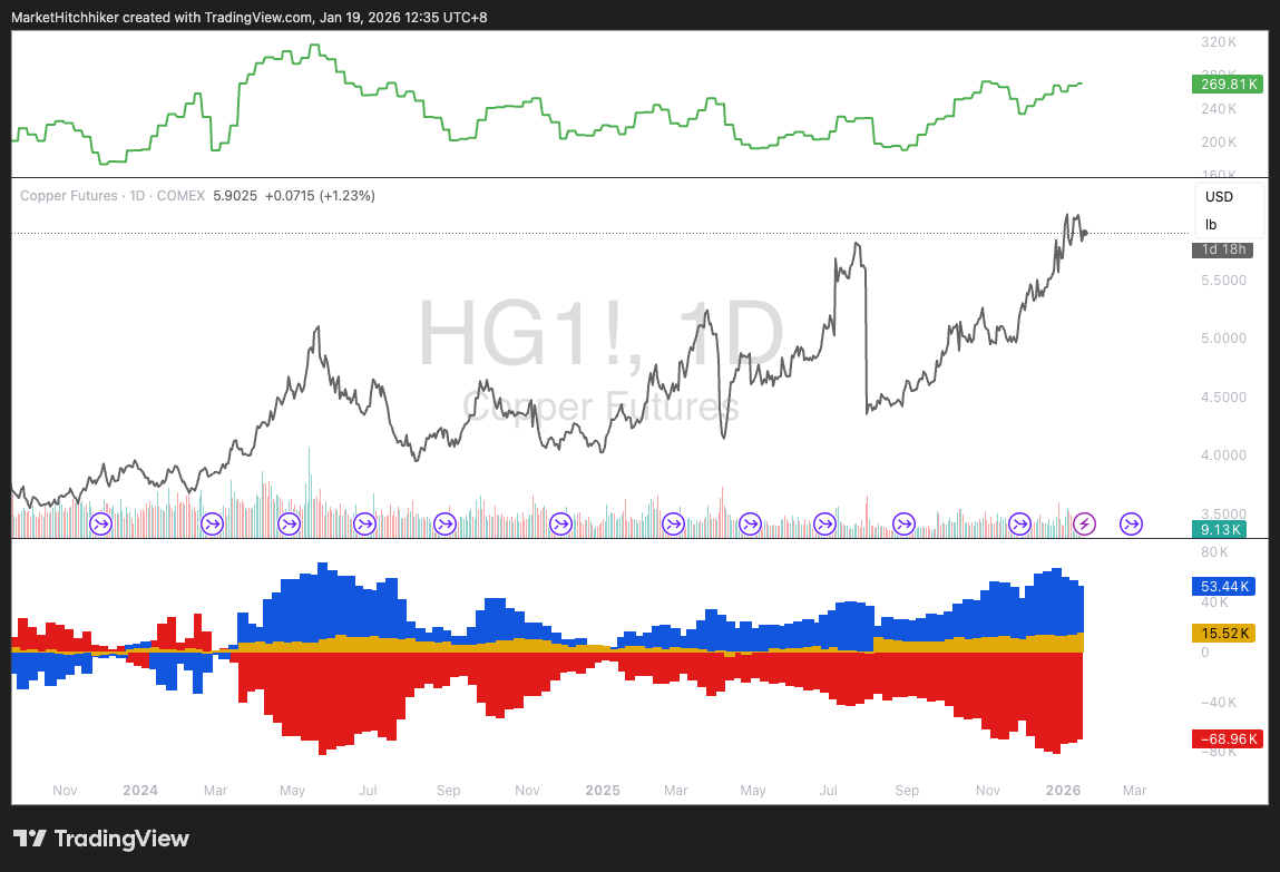 Copper: Interestingly, we are seeing some selling in copper. It was the most crowded trade and turned out to be one of the most disappointing ones in terms of performance relative to gold, silver, and platinum.