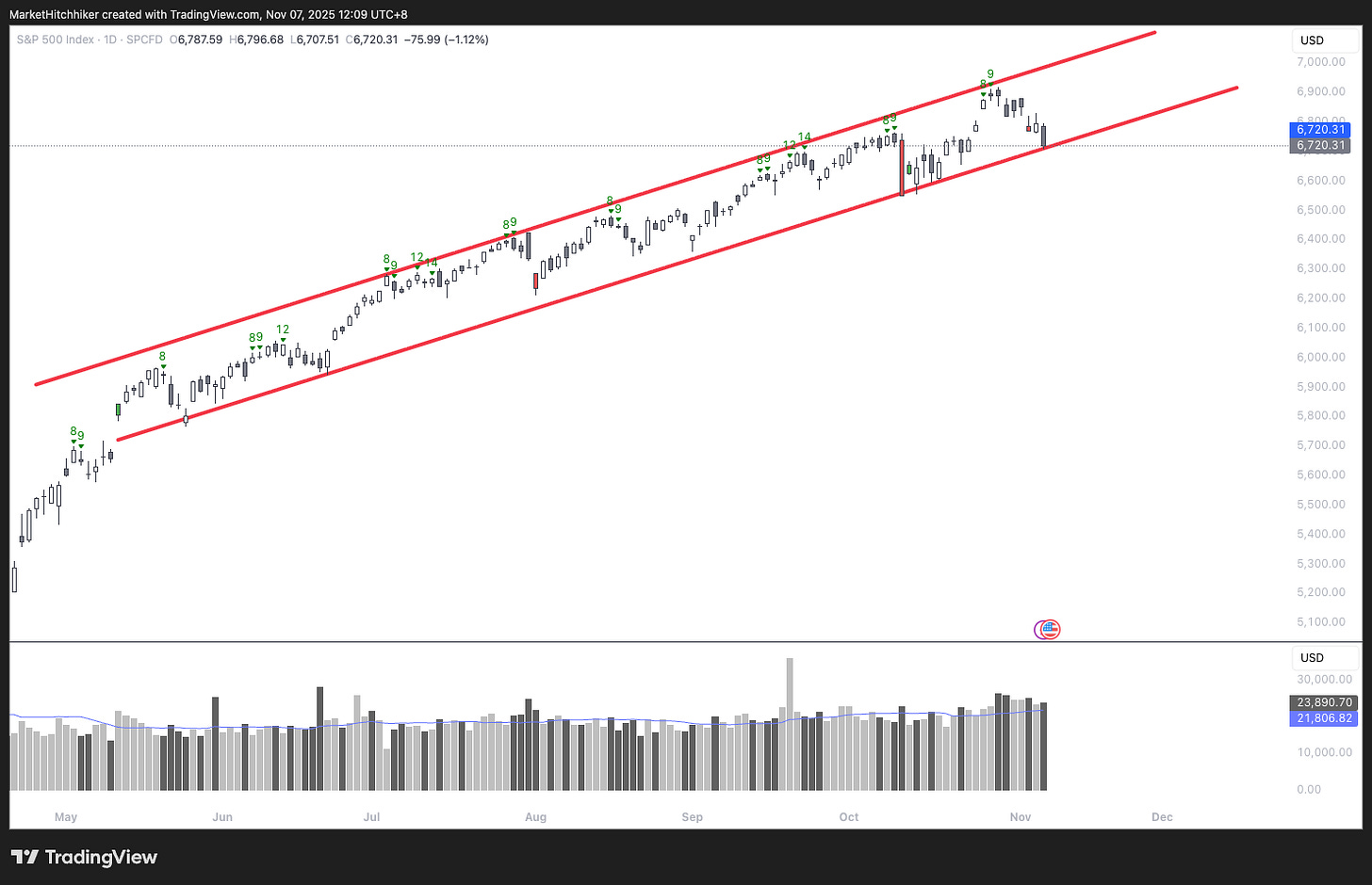 In today’s post, I’m looking very tactically at the S&P 500 sitting on its support trend line. Is this a buying opportunity or not? And no, just drawing a line on a chart is not an edge—sorry if you thought so. Instead, it only indicates that the market has deviated a bit from its historical trend. Now the real question is assessing the risk/reward of a long or short position here.