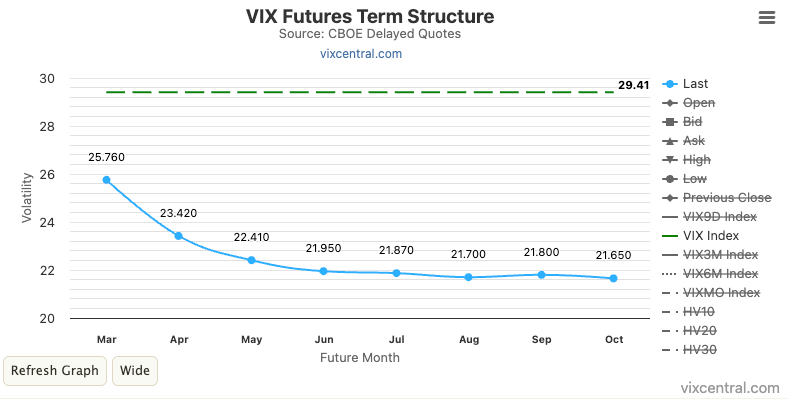 The VIX term structure is in backwardation—nearest expiry contract is higher than the second or third. That’s where we are right now.