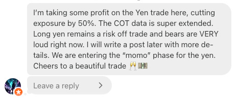 Another green shoot: if you follow me in the chat, I mentioned I took half profits on my JPY position. The CoT data shows large speculators getting insanely long yen—like, longer than they’ve ever been. It’s bullish for the US Stock Market from a contrarian perspective because it kills off the Yen Carry Unwind risk (like the one we saw last summer).