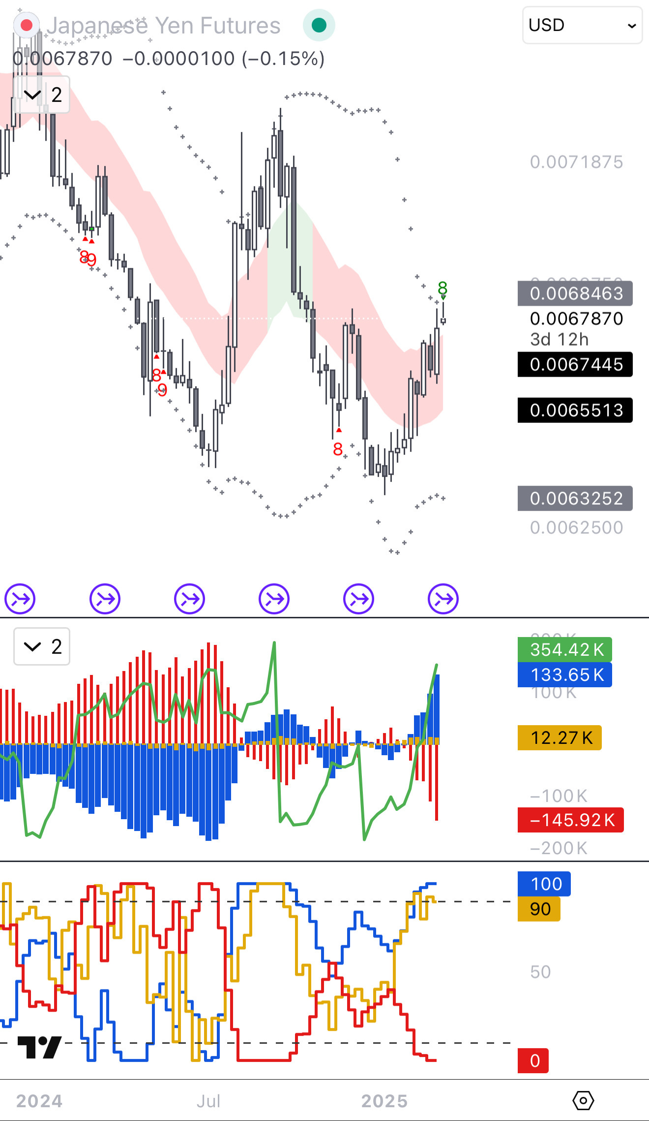 Check the chart below—the Large Speculator Position is the blue columns in the second panel. Open Interest on the futures is exploding too, meaning a ton of fresh money’s piling into the trade. This is both good and bad for our long yen play: