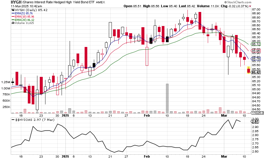 The credit market starts puking. This is your cross-asset confirmation. I track the ETF HYGH (High Yield Bond ETF, duration-hedged) as a proxy for credit spreads. As long as we’re below the 5 days and 10 days EMA, we’re in short-term stress—another box checked for a VaR Event.
