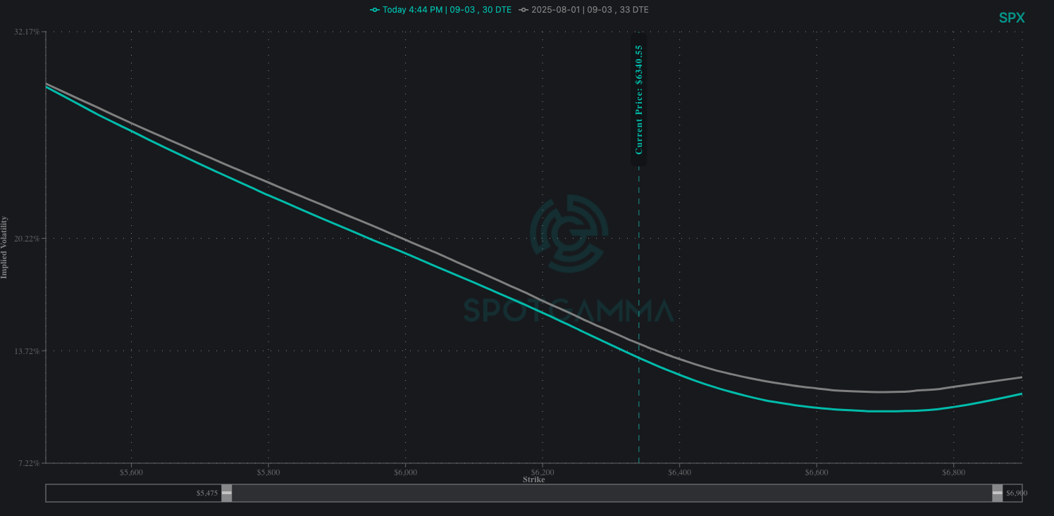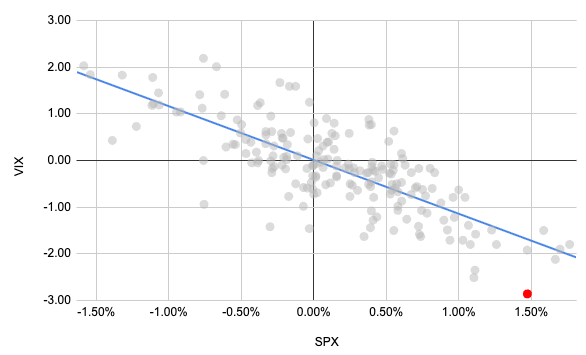 Implied volatility has reversed much of the move as well. The VIX is down 3 points, which is a clear overshoot of the regression trend line (see below chart) against SPX daily moves. The 30-day implied volatility has repriced lower across strikes too. Lots of pain for anyone who bought options previously. We've completely backpedaled on the vol premium from the NFPs. Another day of vol crush, and this will give a strong argument for the bulls.