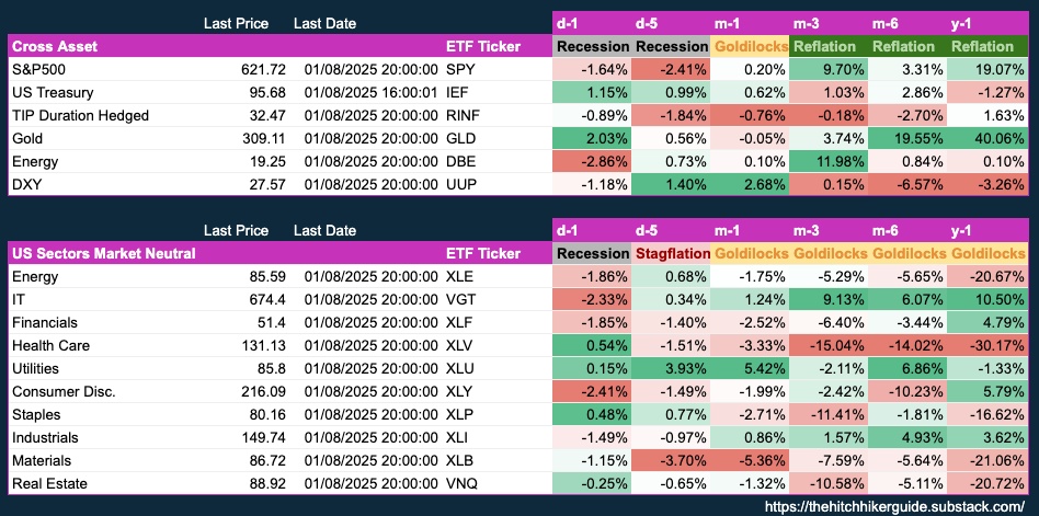 For those following me from the start, you know I map the market into four regimes: Goldilocks, Reflation, Stagflation, and Recession. The table below estimates the current regime based on trailing performance across asset classes and equity sector analysis.