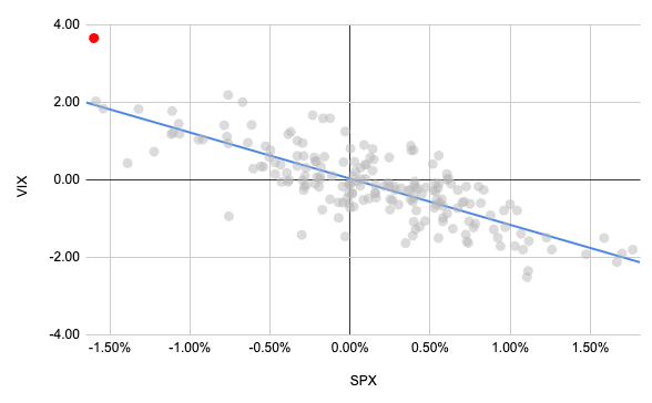 Yesterday’s VIX move was extreme, overshooting the trendline between SPX and VIX moves. Should you fade it? I wouldn’t—it’s too early in the correction. This is an initial warning shot, urging traders to reduce risk.
