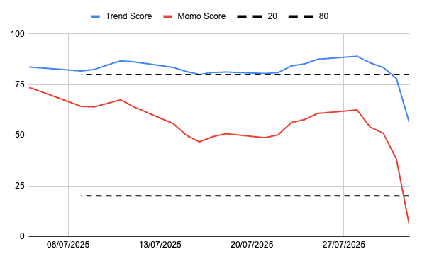 Using implied volatility, VoVol, and correlation, I’ve built an oscillator to track S&P 500 trend and momentum, ranging from 0 to +100. When momentum falls below 20%, we enter a RISK-OFF regime. Typically, the trend score follows, converging toward 0. This signals more downside potential.