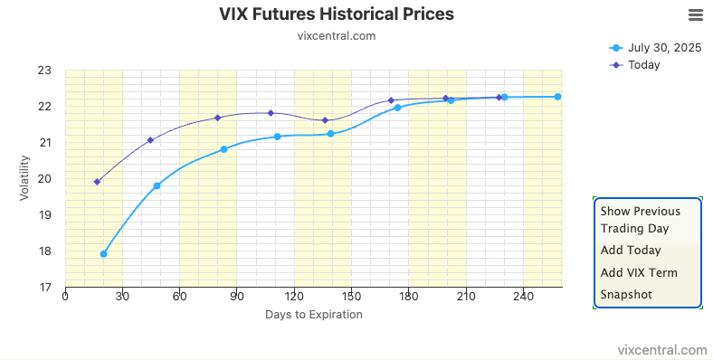 The VIX futures term structure has repriced higher at the front end, but we’re far from max fear. The front-month contract trades below the second and third contracts, indicating fear isn’t fully priced in yet.