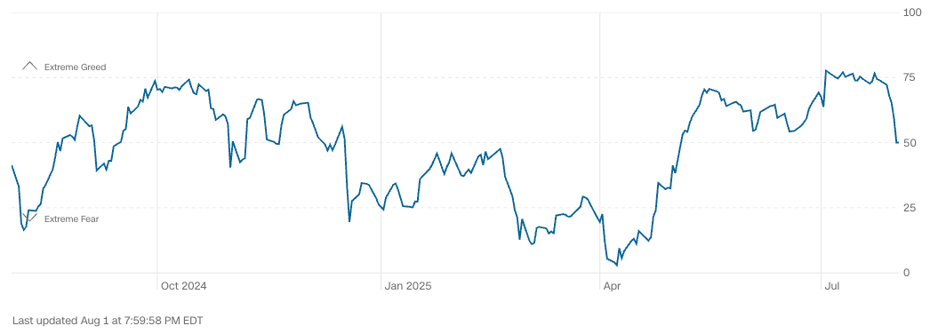 Sentiment is impossible to quantify precisely and is best gauged by closely monitoring social networks like X, as well as headlines and videos posted on YouTube. It’s more art than science! However, we can attempt to measure it with composite indices. CNN’s Fear and Greed Index, while not perfect, provides a broad picture. Sentiment was highly elevated after hitting rock bottom in April. This correction feels completely normal—when sentiment becomes extreme, a pause is often needed.