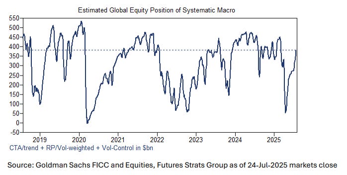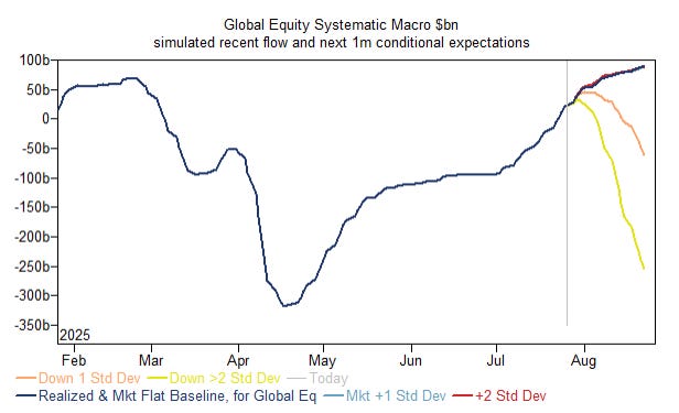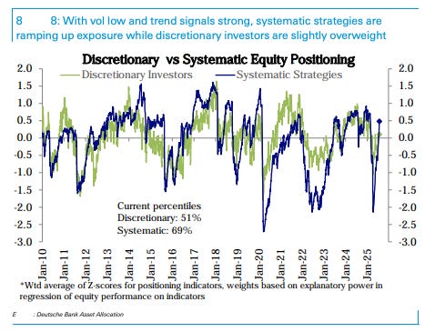 This makes sense, as realized volatility has plunged since Liberation Day, reaching extremely low levels. The chart below shows exponential realized volatility on SPX (10-day, 30-day, 60-day lookbacks). Most Vol Control funds track the max of 30-day and 60-day realized volatility. An uptick is emerging—another couple of days of <-1% returns could trigger the beginning of a deleveraging process.