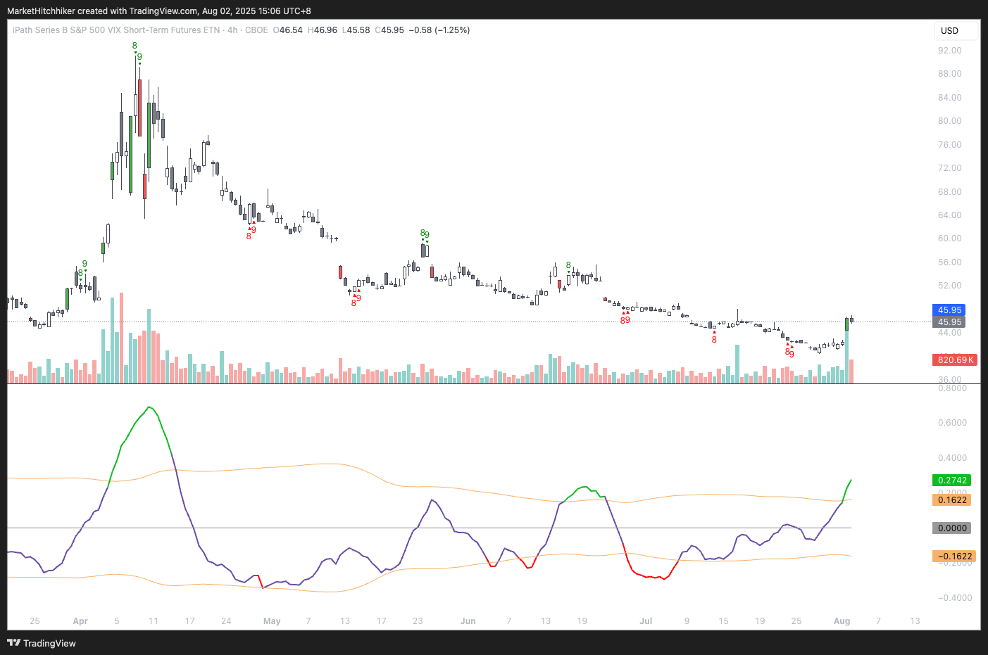The chart below shows 4-hour candlesticks for the VXX ETN, which tracks a rolling VIX futures strategy. I prefer VXX because it trades only during US hours (unlike VIX futures), has constant maturity, and offers clearer volume and volatility signals. My custom indicator tracks the Hawkes Process, with the “self-exciting” feature active (green line) above a threshold. We’ve entered this self-excited regime.