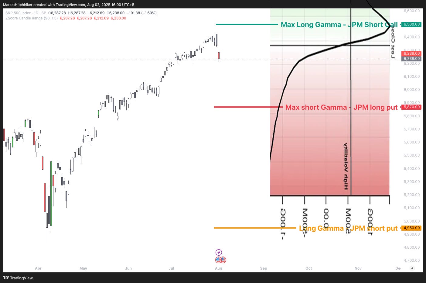 The chart below should be very helpful, overlaying gamma with the candlestick chart. If we follow the same playbook as the March correction, the market may accelerate toward the JPM Collar long put at 5870—our first target.
