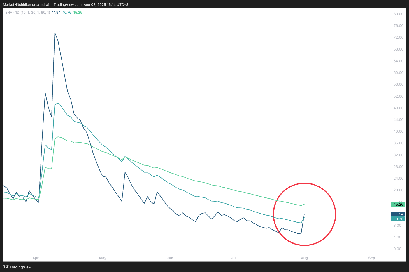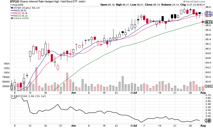 Credit spreads are at all-time lows, so I’ll be closely monitoring HYGH in the coming days. We’ve lost some short-term moving averages, confirming the potential for a larger move. I bought a few put options on HYG yesterday (not HYGH due to low liquidity), as implied volatility (IV) is cheap and the risk/reward is compelling.