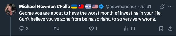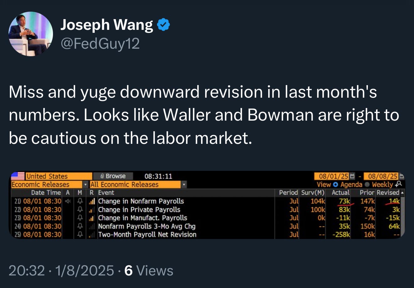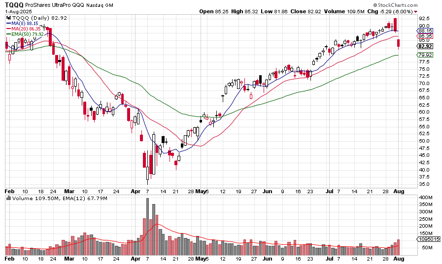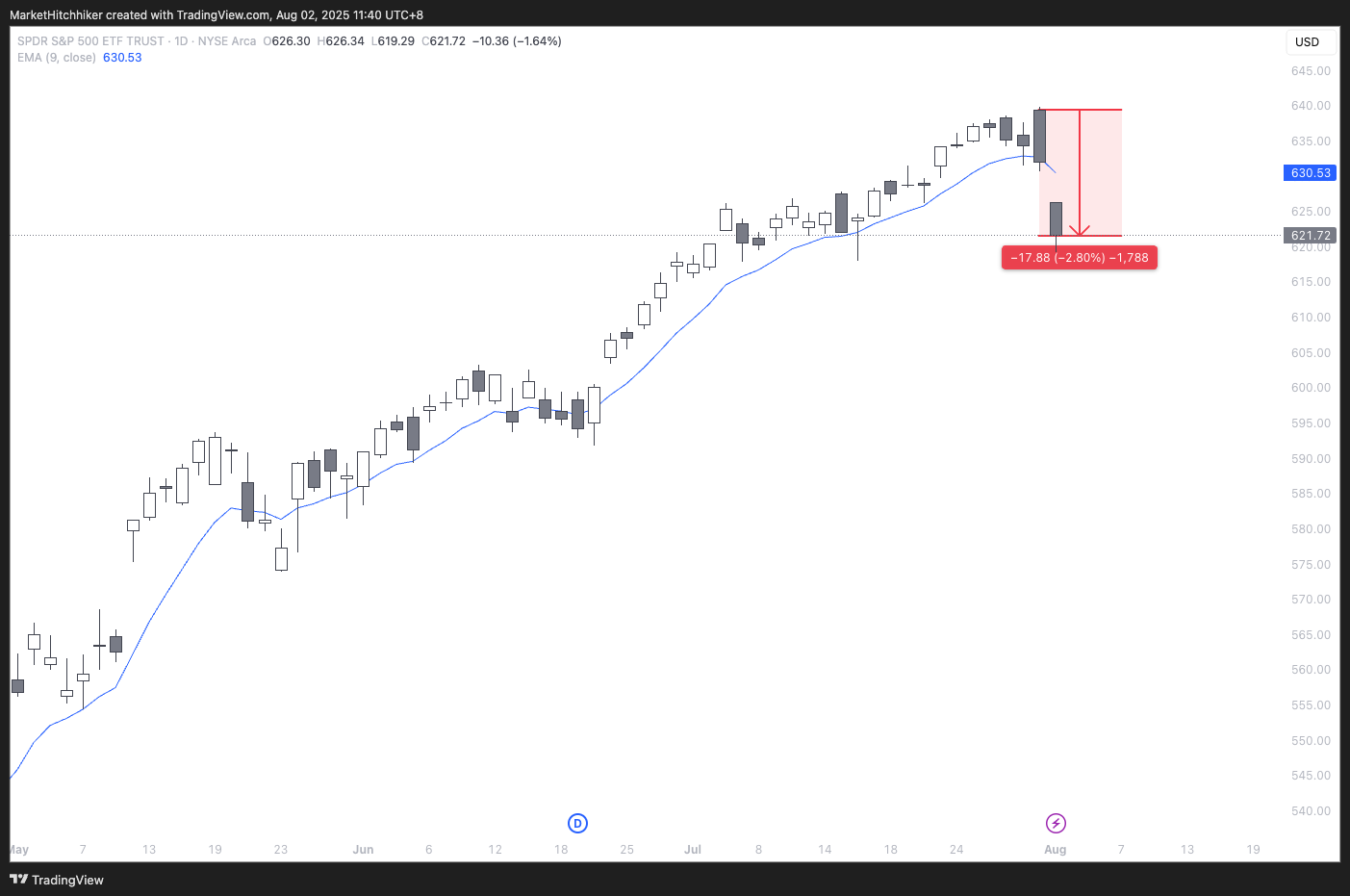August 1: Bad news hit the tape with Trump imposing new tariffs and a very weak NFP report. The S&P 500 closed -1.64% lower. The “buy the dip” crowd was absent.