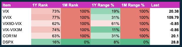A quick look at ranks and ranges in the table below provides a snapshot. Most indicators (except DSPX) have hit elevated levels, maxing out the 1-month lookback—not surprising given the market’s low volatility during its prior uptrend. However, there’s still upside potential on a 1-year lookback, which includes Liberation Day.