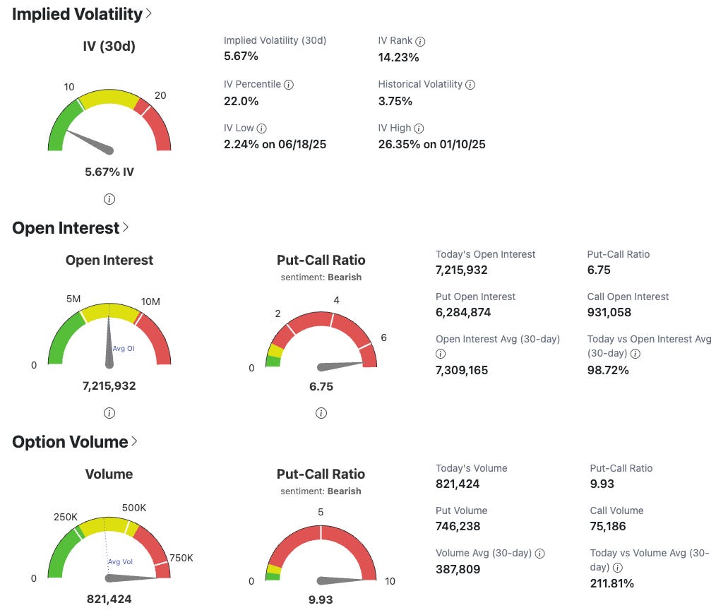 Interestingly, HYG’s implied volatility remains low, while flow and positioning are turning bearish, as evidenced by Open Interest and Option Volume: