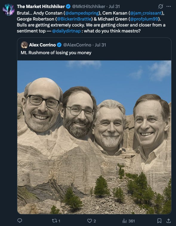 Should this correction turn into a complete rout, the next target is 4950. This isn’t my base case, but let’s keep an open mind. The market has a peculiar tendency to crash both upward and downward, driven by “negative gamma” systematic strategies like CTAs, Vol Control funds, Collar ETFs, and the general tendency for traders to chase momentum.