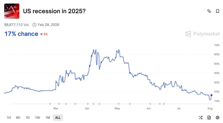 The emerging regime is Recession. This aligns with growing market concerns about the job market after significant negative revisions to NFP numbers. A slowing job market suggests slower growth and likely lower inflation due to reduced consumer demand. The Fed hasn’t cut rates due to uncertainty around tariffs and their impact on inflation. The market is shifting from pricing loose financial conditions to very tight ones, with a rate cut now expected in September.