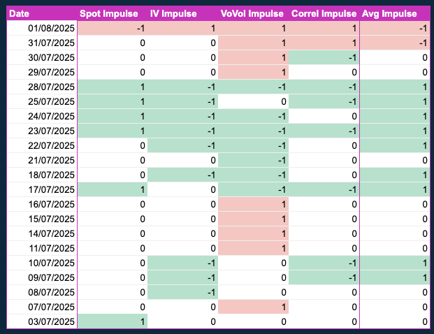 VoVol was the first warning, followed by correlation two days ago, confirming the risk-off move. This is the first time in a while all four impulses are negative, following a long stretch of neutral or positive impulses. It’s too early for this correction to end—I’d want to see neutral impulses indicating exhaustion.