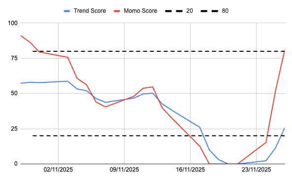 My trend and momentum score has triggered a buy signal with momentum score crossing over 80 while trend score is still around 20.