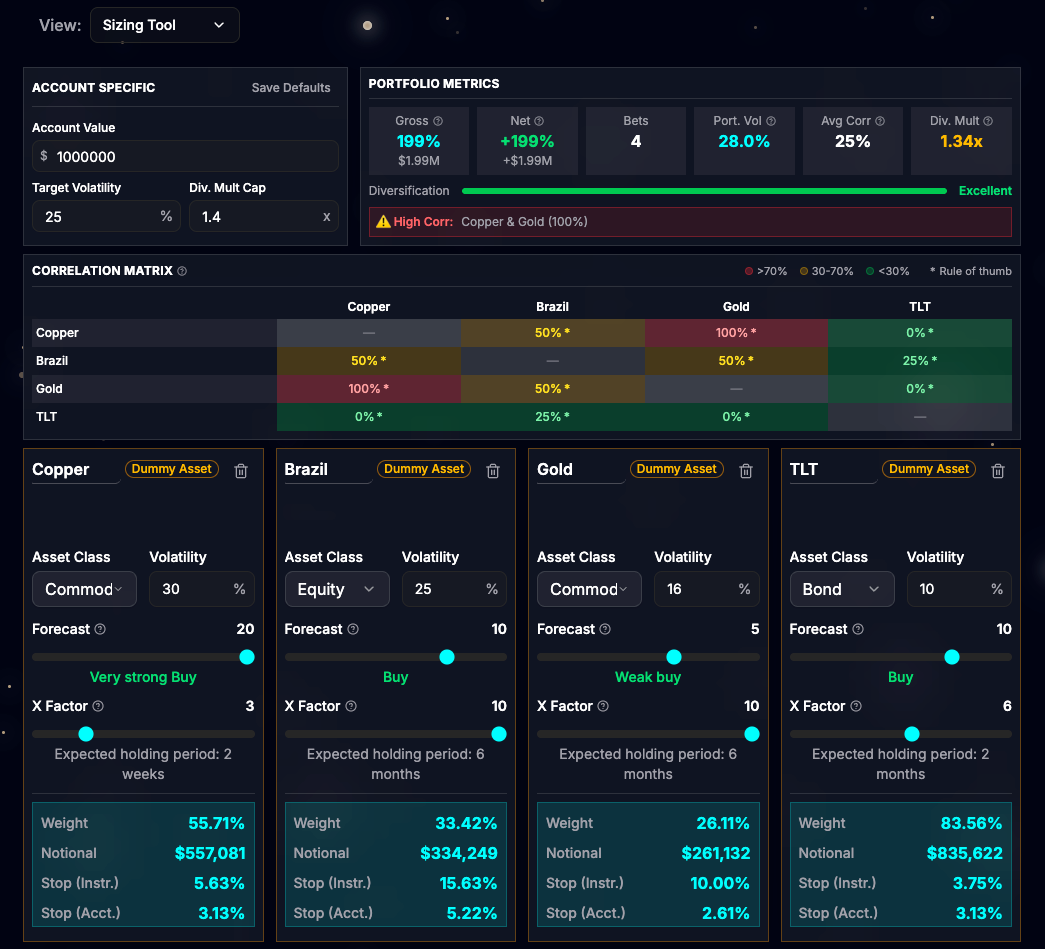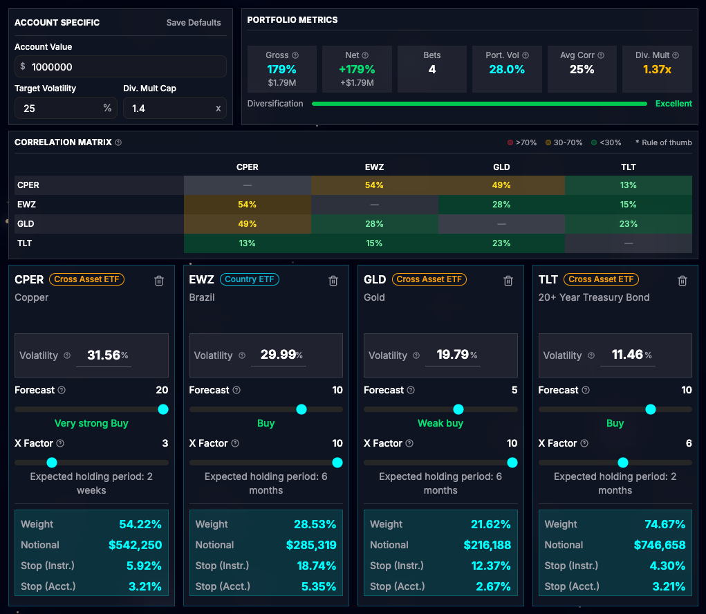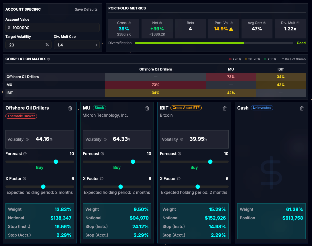 Like me, however, you prefer to run an average of four bets with a 20% target volatility. This provides concentration while still capturing diversification benefits. If you currently lack strong conviction for a fourth idea, using only three bets in the sizing tool would make the portfolio too aggressive. Adding a fourth bet of the Cash type solves this: the weights will be computed assuming four total bets. Indeed, when calculating the instrument weight for a given bet, we divide by the total number of bets: